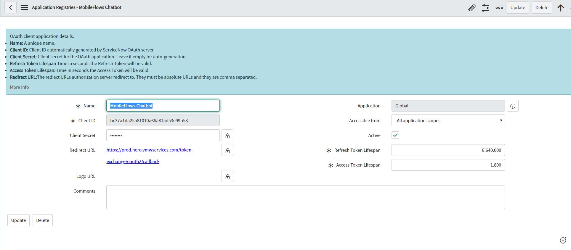 - client_id: paste the client id from the OAUTH application in ServiceNow