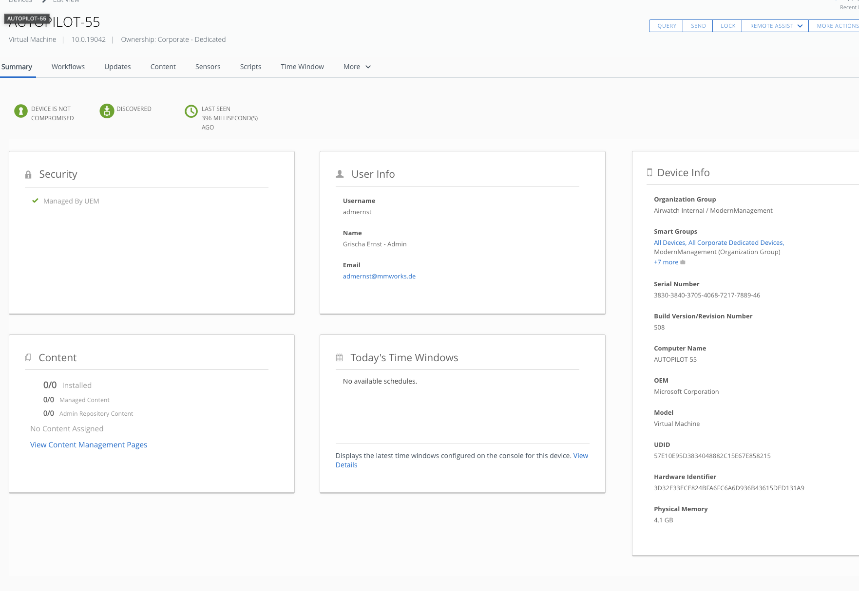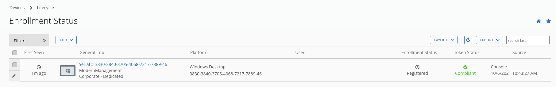 After you pre-register the device you can now enroll the device. The enrollment will work as expected and the device will show up as “Enrolled” in the console. Normally we wouldn’t touch the registration entry again BUT in case you do a bulk import for blocking devices the existing entry gets overwritten and the device gets blocked.
