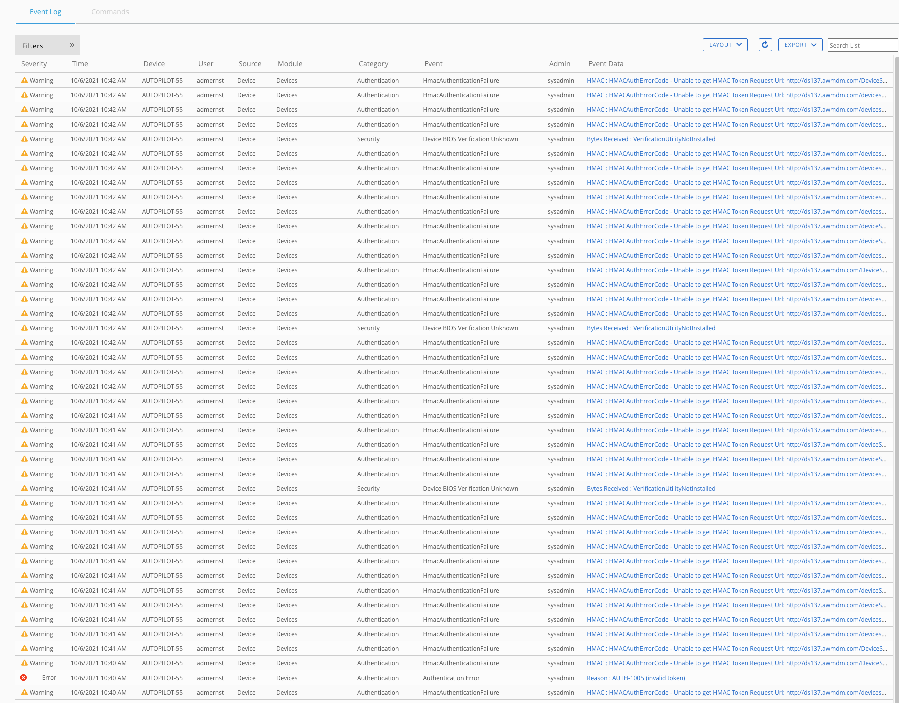 {"@t":"2021-10-06T15:19:56.8880021Z","@mt":"Hmac retrieval with OTA from Installer Argument failed : SOURCE: [AgentSideLoad], ERROR_CODE: [2012], ERROR_MESSAGE: HMAC Authentication failed., ERROR_RESPONSE: Authentication status : Failed, Description : Failed, Status-Code : AUTH-1005","@l":"Error","SourceContext":"AW.Win32.Unified.Hmac.HmacHelper","ThreadId":3,"ProcessId":6228,"ProcessName":"AWProcessCommands","MachineName":"AUTOPILOT-86"}