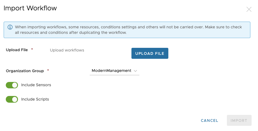 Once you exported or downloaded a workflow, you can now use the import functionality in the Workspace ONE console.
